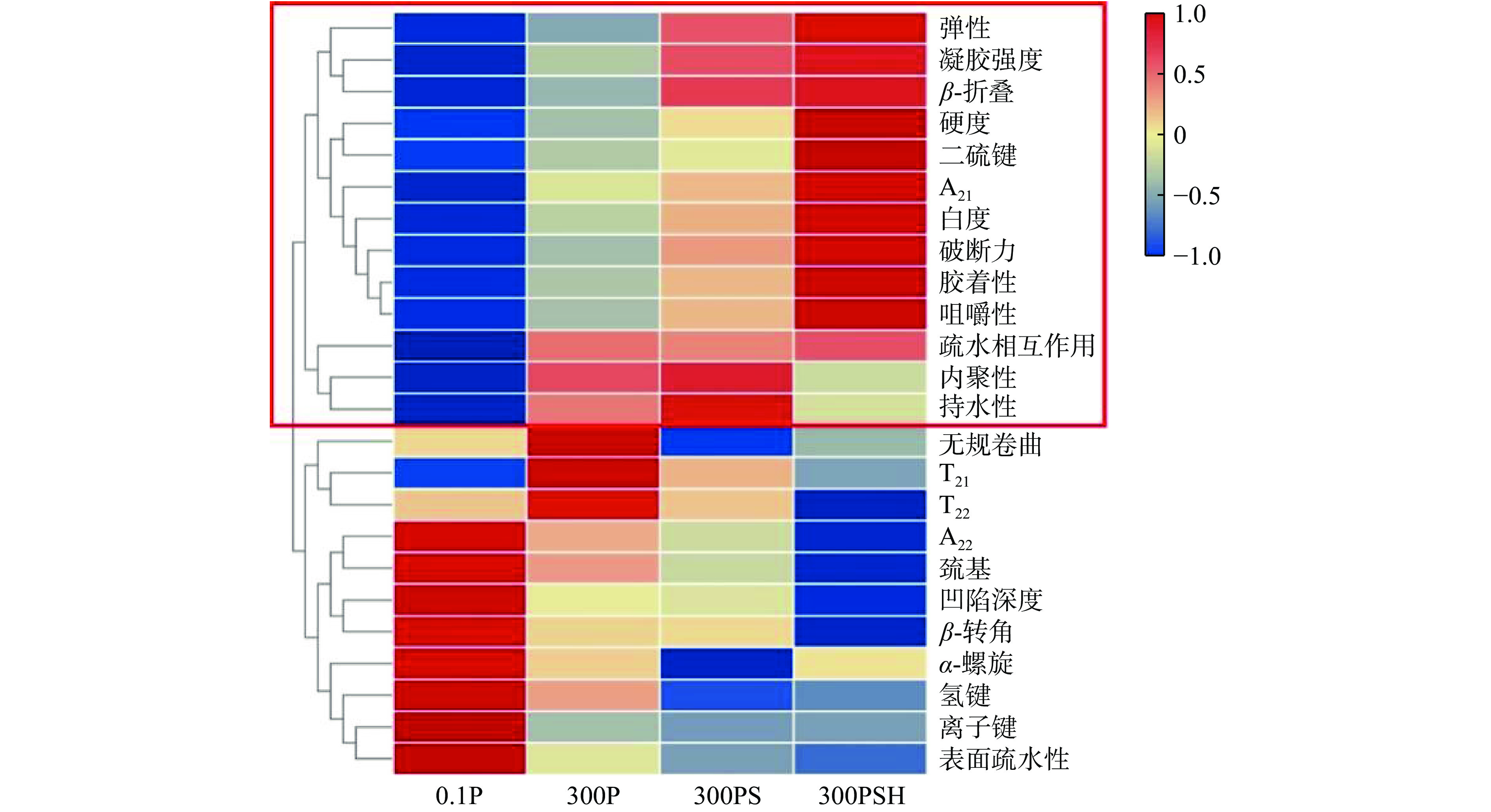 In order to elucidate the mechanism of the changes in gel properties of bighead carp surimi during ultra-high pressure coupled heat treatment, this paper investigated the changes in gel properties, protein structure and water migration of bighead carp surimi during ultra-high pressure coupled heat treatments (300 MPa/5 min, 40 ℃/30 min, 90 ℃/20 min), and carried out clustered heat maps and Pearson correlation analyses. The results showed that ultra-high pressure coupled heat treatment significantly improved the gel properties of bighead carp surimi (
