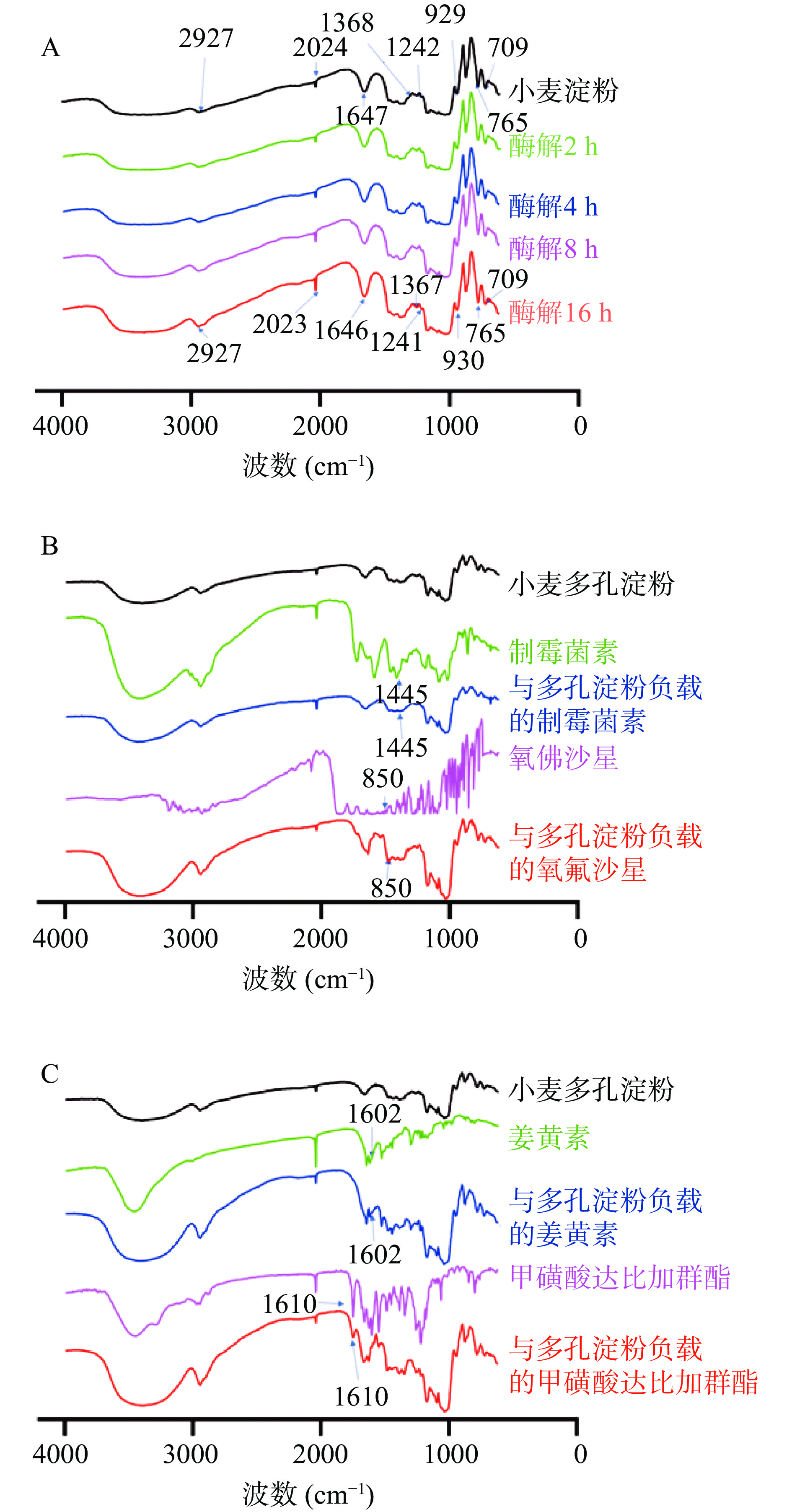 α-1,6-glycosidic bonds ability to prepare porous wheat starch. The structure of the starch was analyzed by X-ray diffraction, Fourier-transform infrared spectroscopy, scanning electron microscopy, and particle size analysis. The rates of starch swelling, oil and water absorption, and drug loading, as well as solubility, were measured. The results showed the formation of pores on the starch surface after treatment at 50 ℃ for 16 h, together with reduced particle sizes, while the crystal structure of the starch did not change significantly. The specific volume of the porous starch was 2.11±0.02 cm