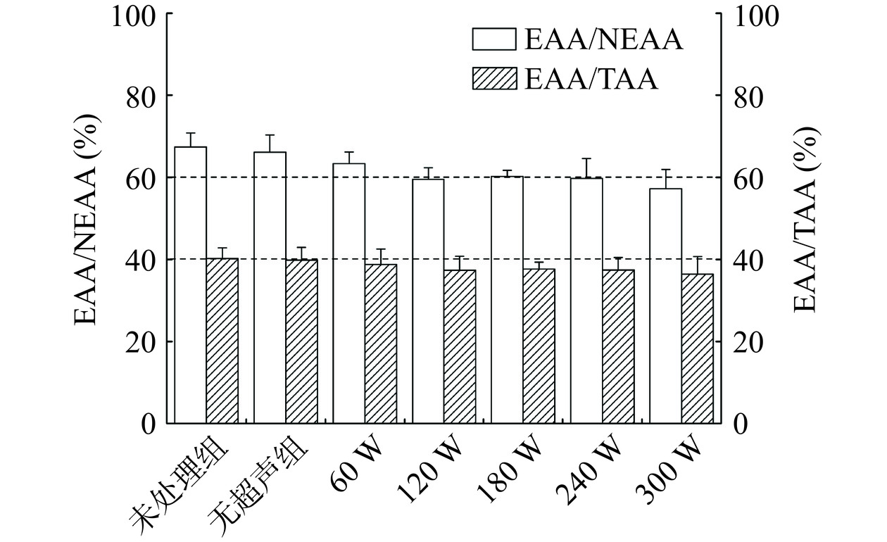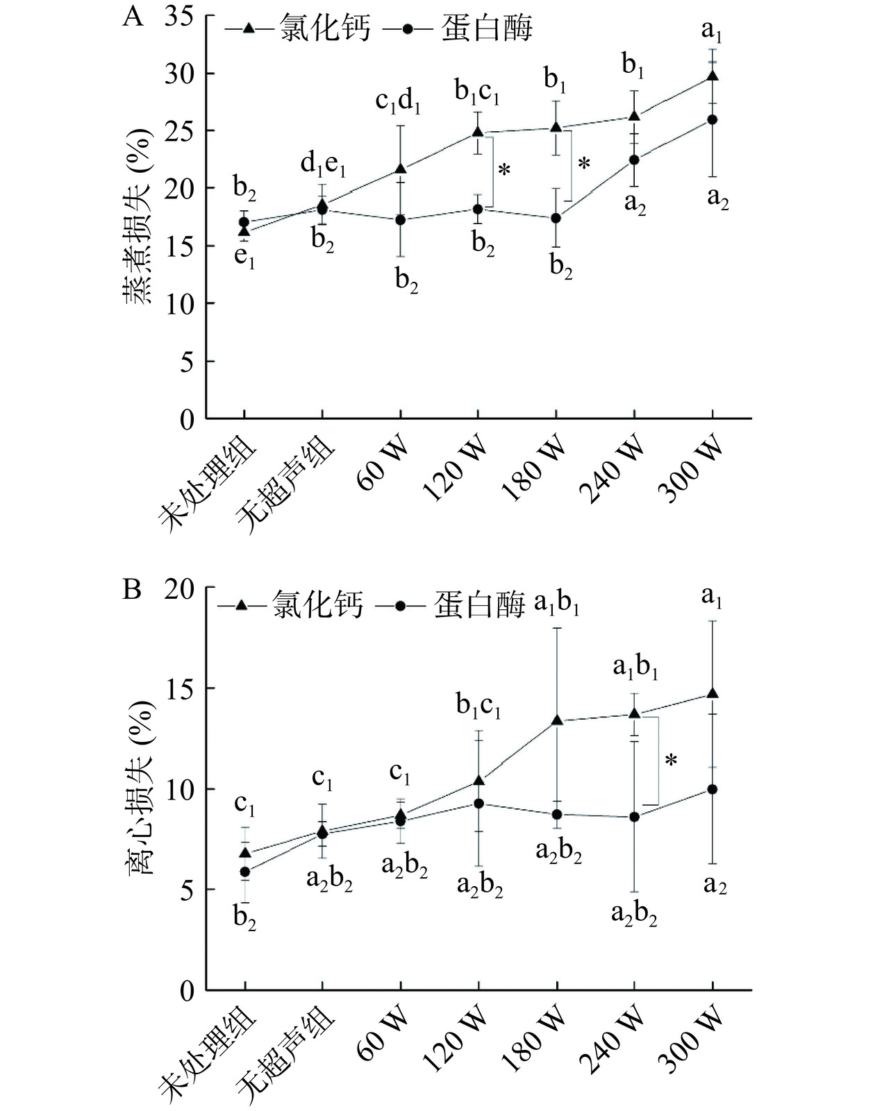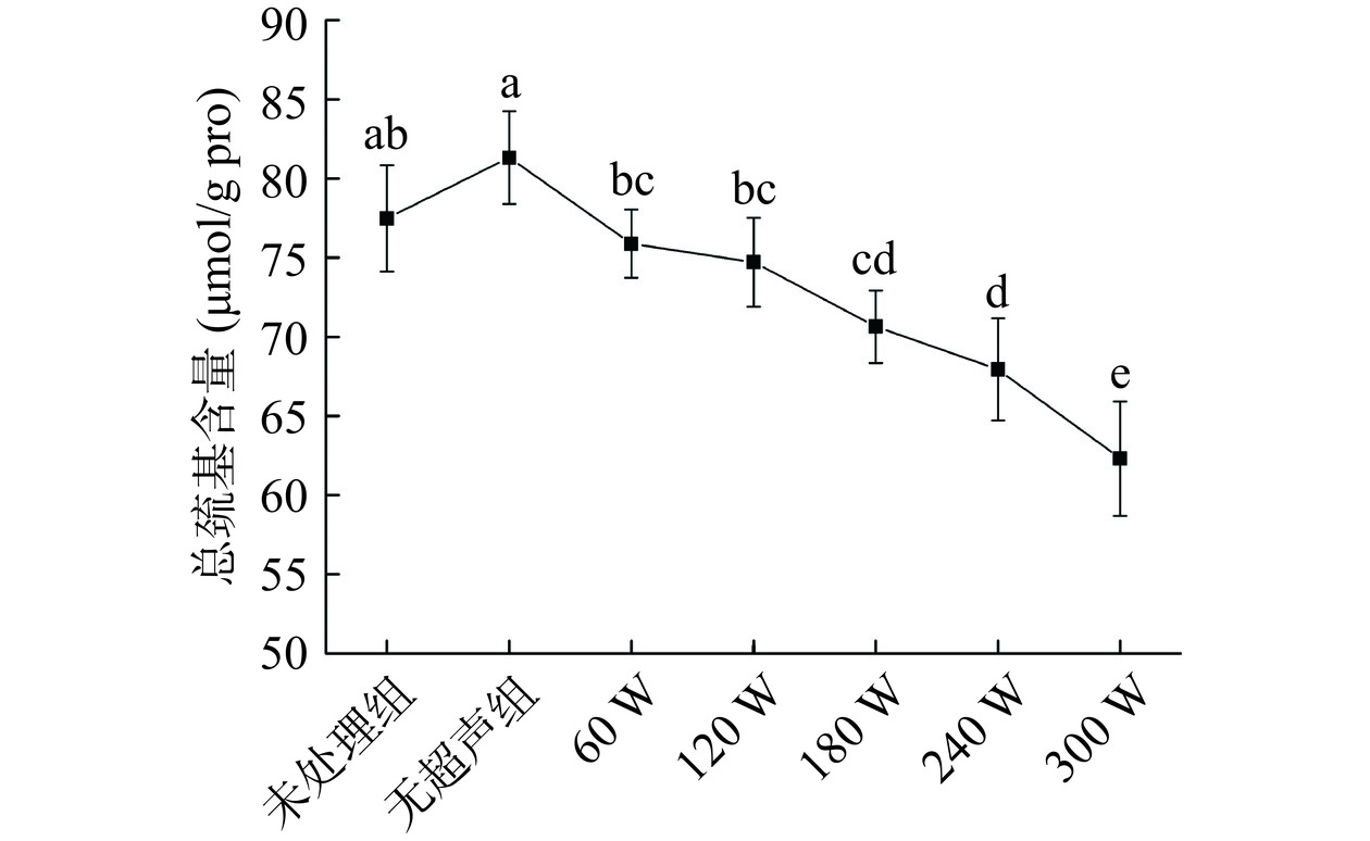 P<0.05) of 56.54% in chewiness, which was significantly better than that of calcium chloride. Meanwhile, the degree of cooking loss and centrifugation loss of meat were also lower than that of calcium chloride. The electrophoresis results showed that the high molecular weight myosin heavy chain was degraded near 116 kDa, indicating that some myofibrillar proteins were decomposed. Among them, the total thiol content also continuously decreased, and the chicken proteins were oxidized. When the ultrasound power continued to increase to 300 W, the content of essential amino acids threonine, valine, and lysine in chicken breast meat significantly decreased (