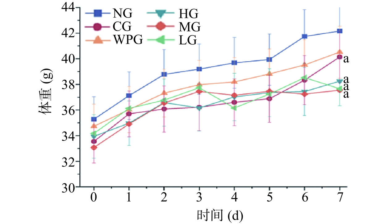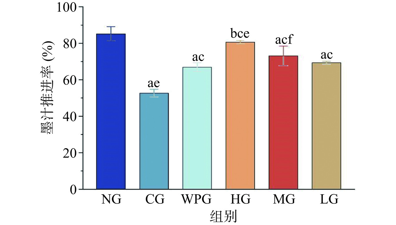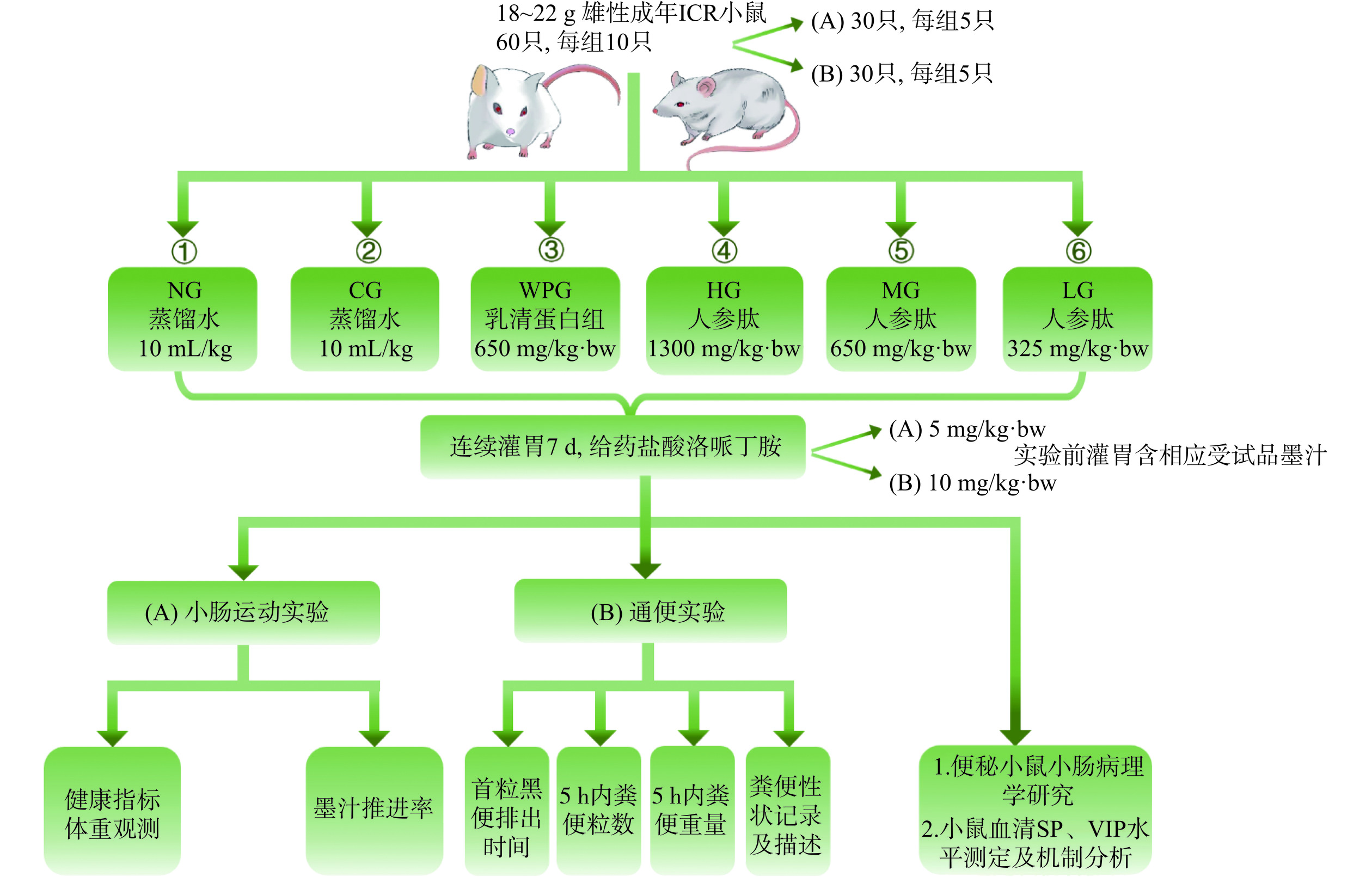 Objective: To study the moisturizing and laxative effects of ginseng peptides (GPs) on the constipation model of ICR mice, and provide theoretical basis for the further development and utilization of GPs and clinical adjuvant treatment of constipation. Methods: Sixty adult male ICR mice were randomly divided into 6 groups, they were normal group (NG), constipation group (CG), whey protein group (WPG), low-dose GPs group (LG), medium-dose GPs group (MG), high-dose GPs group (HG). Except NG, mouse constipation model was established using loperamide hydrochloride (LH). After 7 consecutive days of intervention with GPs, the small intestine peristalsis and defecation time, as well as pathological changes in the small intestine villus tissue of each group of mice were observed and compared. The improvement effect of GPs on mouse constipation was evaluated by detecting the content of brain gut peptide indicators in the serum of each group of mice, including substance P (SP) and vasoactive intestinal peptide (VIP). Results: Compared with the model group, the high, medium, and low dose groups of GPs significantly increased the small intestine ink advance rate in mice (