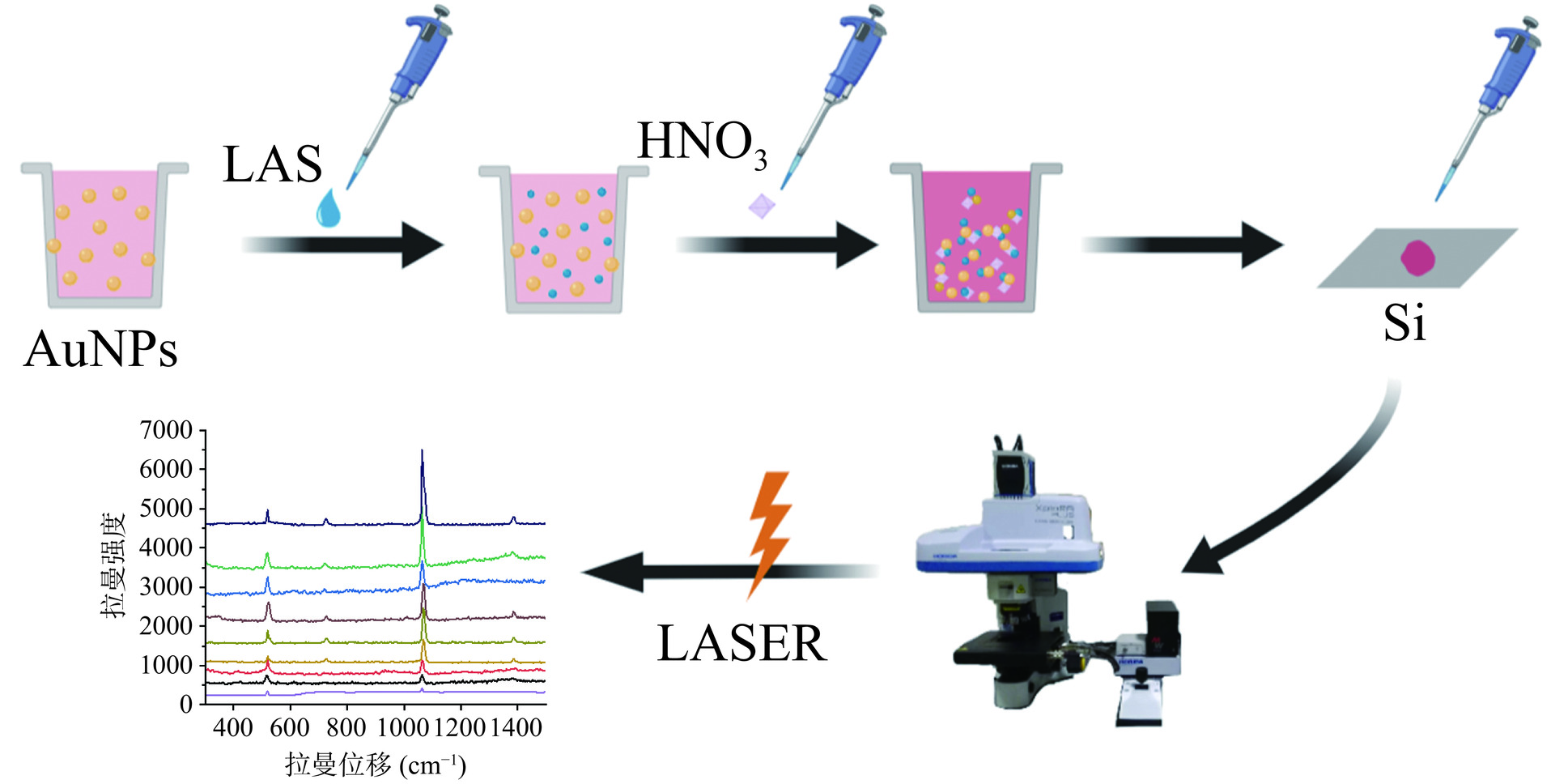 3, AuNPs aggregation degree was changed and LAS solubility was increased to further enhance SERS signal. Finally, the method was evaluated by establishing the standard curve and the recovery test of chicken sample. Results showed that AuNPs with a particle size of 40 nm had good enhancement effect, the SERS characteristic peak of LAS was at 1118 cm
