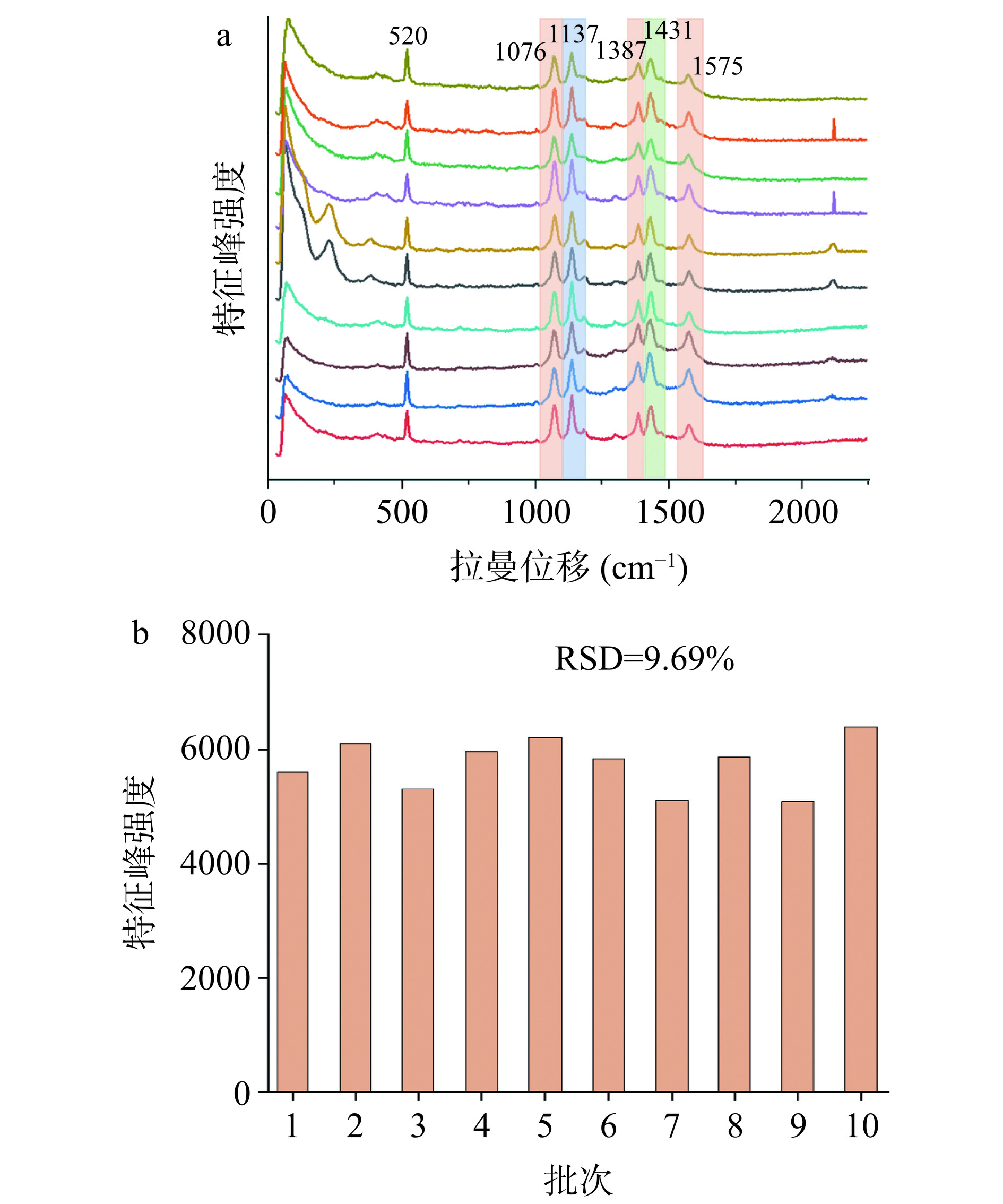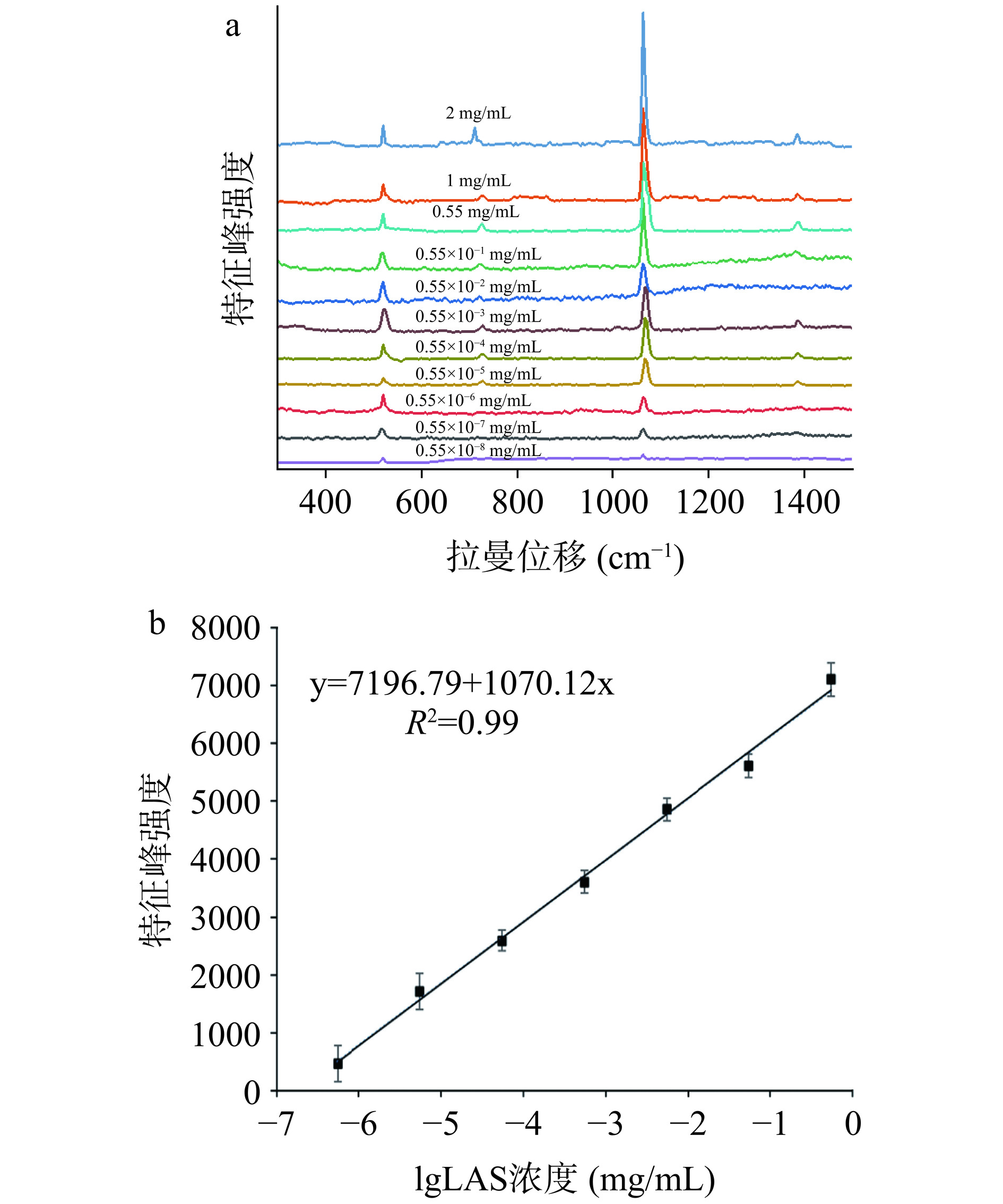 −6~0.55 mg/mL, the detection limit was 0.23 ng/mL, the recovery rate of chicken samples was 91.9%~107.3%, and the relative standard deviation was 3.6%~5.7%, which was consistent with the detection results of the national standard method (GB31613.5-2022). This study provides a new method for the sensitive detection of LAS residues, and has reference value for the study of SERS detection method of other veterinary drug residues.