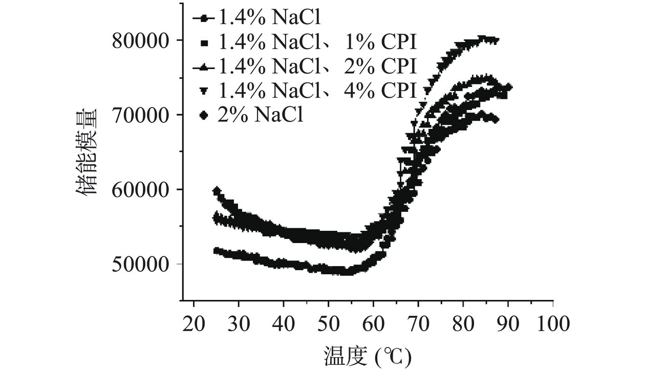 22, which proved that the salt-reduced big bone chicken meatballs had the best water retention under this condition. Rheological characteristics showed that (1.4%NaCl, 4%CPI) treatment group had the largest energy storage modulus and the best elasticity. Scanning electron microscopy showed that compared with other treatment groups, the structure of big bone chicken meatballs gel treated with (1.4%NaCl, 4%CPI) was more compact and better continuity. In summary, the addition of 1.4%NaCl and 4%CPI is conducive to improving the gel quality of CPI salt-reduced big bone chicken meatballs.