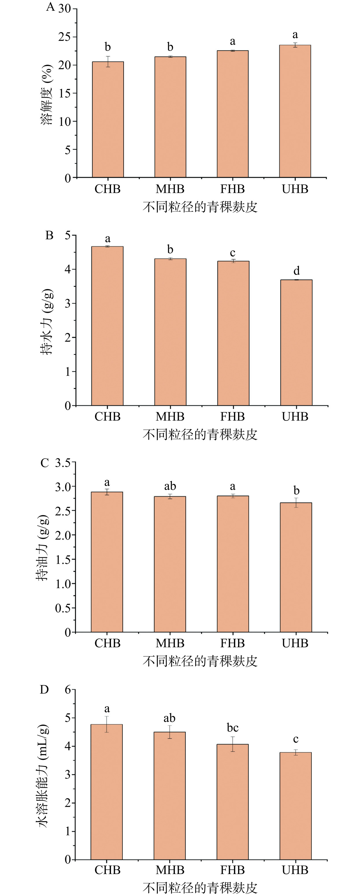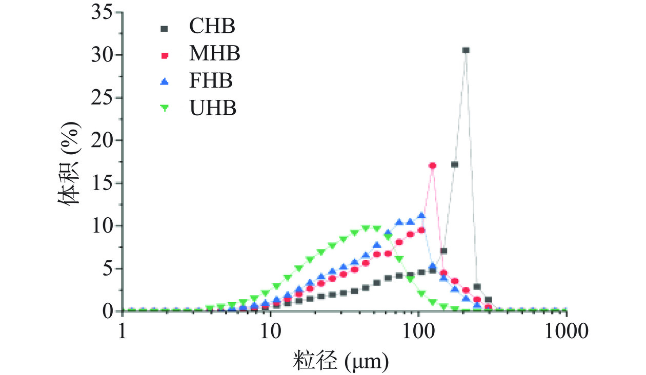 • 摘要: 为研究粒径变化对青稞麸皮的结构、理化及功能特性的影响,本研究采用了不同强度的气流冲击磨(Airflow impact milling,AFIM)对粗青稞麸皮(Coarse highland barley bran,CHB)进行碾磨。获得了平均粒径为69.04 µm的中青稞麸皮(Medium highland barley bran,MHB)、58.85 µm的细青稞麸皮(Fine highland barley bran,FHB)和32.04 µm的超微青稞麸皮(Ultrafine highland barley bran,UHB)。从粒径分布、微观结构、理化组成、孔隙特征以及功能特性等方面对这四种样品进行了多重表征。结果表明:随着青稞麸皮的粒径减小,部分不溶性膳食纤维(Insoluble dietary fiber,IDF)转化为可溶性膳食纤维(Soluble dietary fiber,SDF),导致SDF在总膳食纤维中的比例由7.18%(CHB)增加到8.50%(UHB)。显微结果与孔隙特征研究显示,随着粒径减小,青稞麸皮的堆积状态变得更加紧密,50 nm~10 µm微孔在青稞麸皮孔隙中逐渐占据主导地位,从CHB组的31%提高至UHB组的69%。麸皮的组成和结构变化影响了其持水力、持油力等水合特性,相较于CHB,UHB的这两个指标分别降低了21%与7.64%。体外葡萄糖吸附实验表明,随着粒径减小,青稞麸皮对高浓度葡萄糖的吸附能力和抑制扩散的能力增强。综上所述,气流冲击磨通过物理改性有效降低了青稞麸皮的粒径分布,同时显著改变了麸皮的化学组成、微观结构、孔隙结构和颗粒间堆积状态,进而影响了其理化及功能特性的发挥。