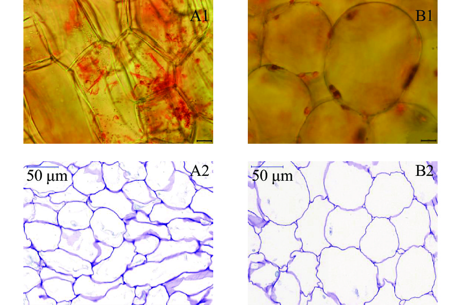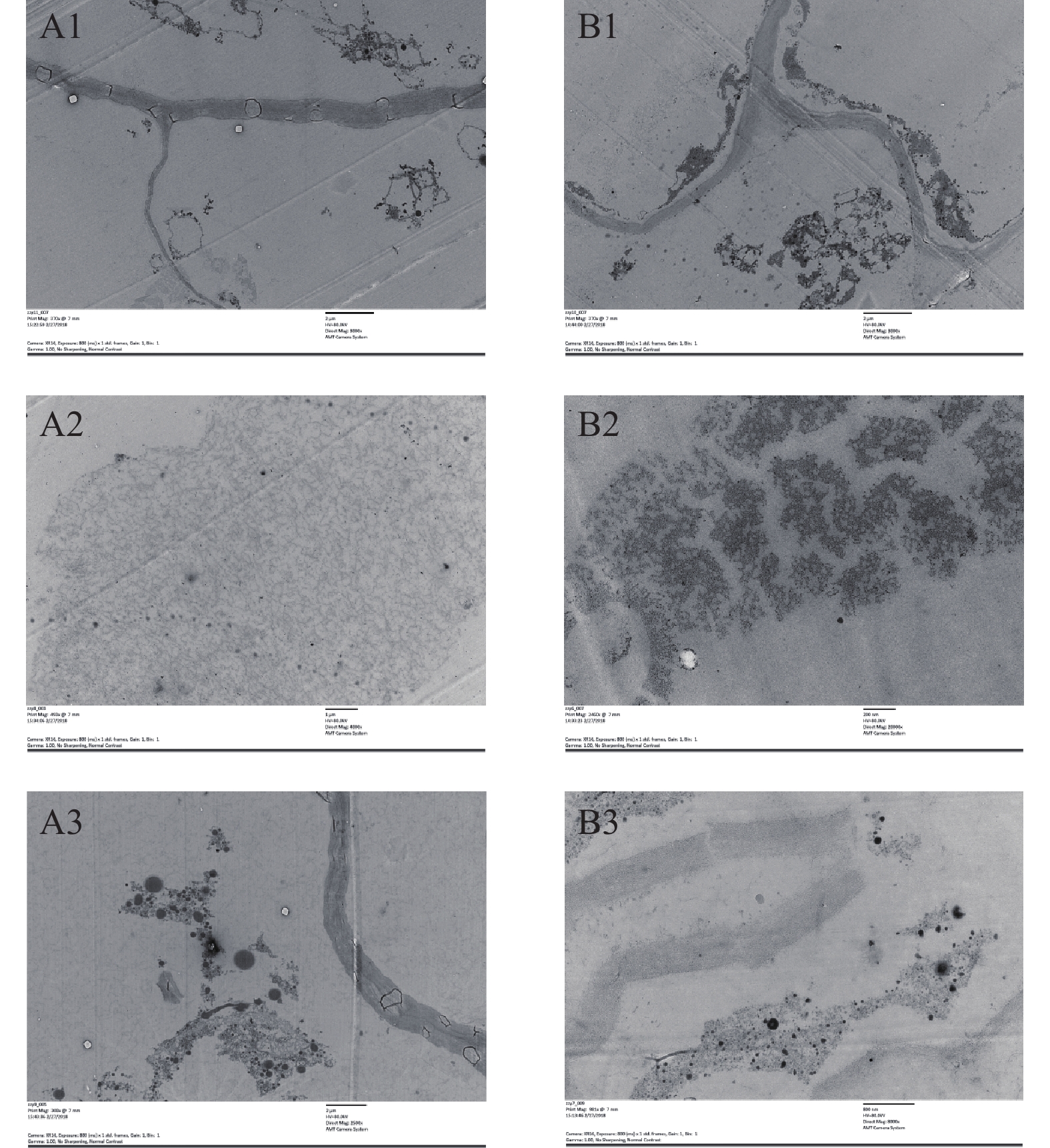 in vitro simulated digestion model, and the changes of cell wall microstructure were observed by transmission electron microscope (TEM) and optical microscope. The results showed that the cell walls of carrot and pumpkin were broken and the chromosomal structure was damaged seriously after MVD. After simulated digestion