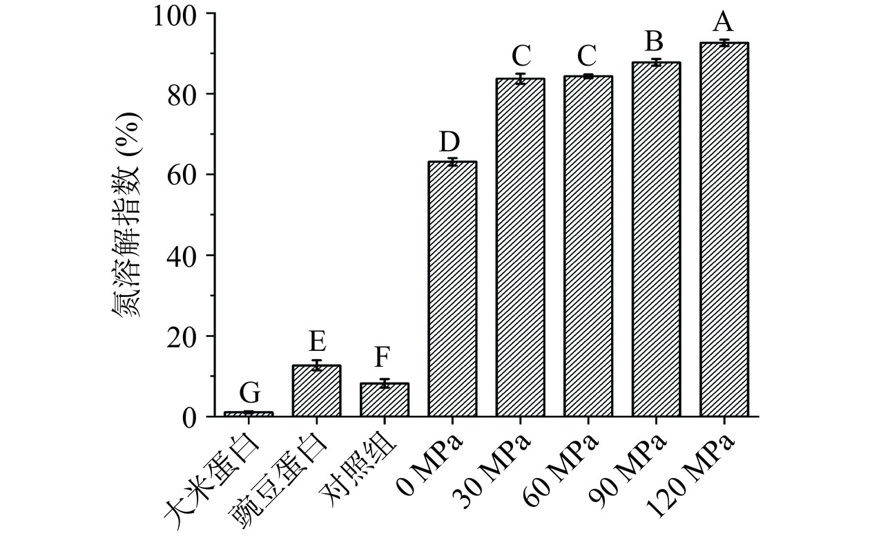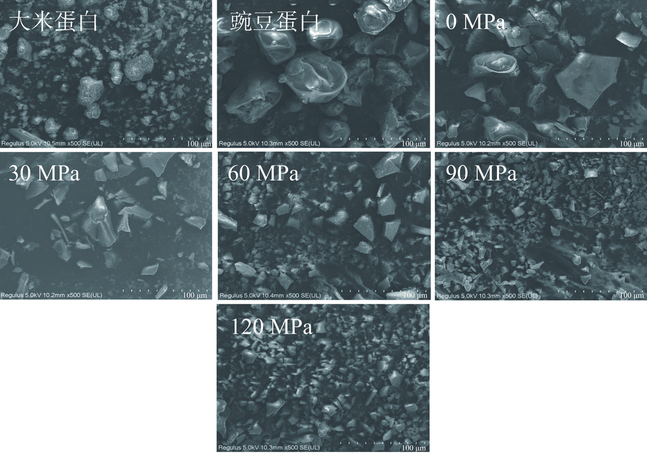 To investigate the solubilization of composite plant protein after co-processing with an industry-scale microfluidizer and pH cycling and to clarify its solubilization mechanism, this paper used rice protein and pea protein as raw materials, a mixed protein solution with a protein ratio of 1:1 and a total protein concentration of 4% were configured. The pH of the mixture was then adjusted to 12 and the solution processed at different pressures in a high-pressure jet mill. The composite protein was then obtained by adjusting the pH of the solution back to neutral. And to characterize the changes in physicochemical properties and structure of composite protein during this process using nitrogen solubility index, particle size, fluorescence spectroscopy, circular dichroism, molecular weight, and other means. Results showed that the nitrogen solubility index of 4% composite protein underwent industry-scale microfluidizer and pH cycling treatment was increased with the increase of pressure, reaching the maximum of 92.67%±0.77% at 120 MPa. The results of scanning electron microscopy and particle size showed that the composite proteins decreased in size and the specific surface area increased after the treatment of the industry-scale microfluidizer. The results of intrinsic fluorescence spectroscopy, surface hydrophobicity, sulfhydryl disulfide bonding, and circular dichroism indicated that the two proteins interacted to form new co-assembly composites. Surface hydrophobicity increased significantly from 4025.33 to 7359.45 (