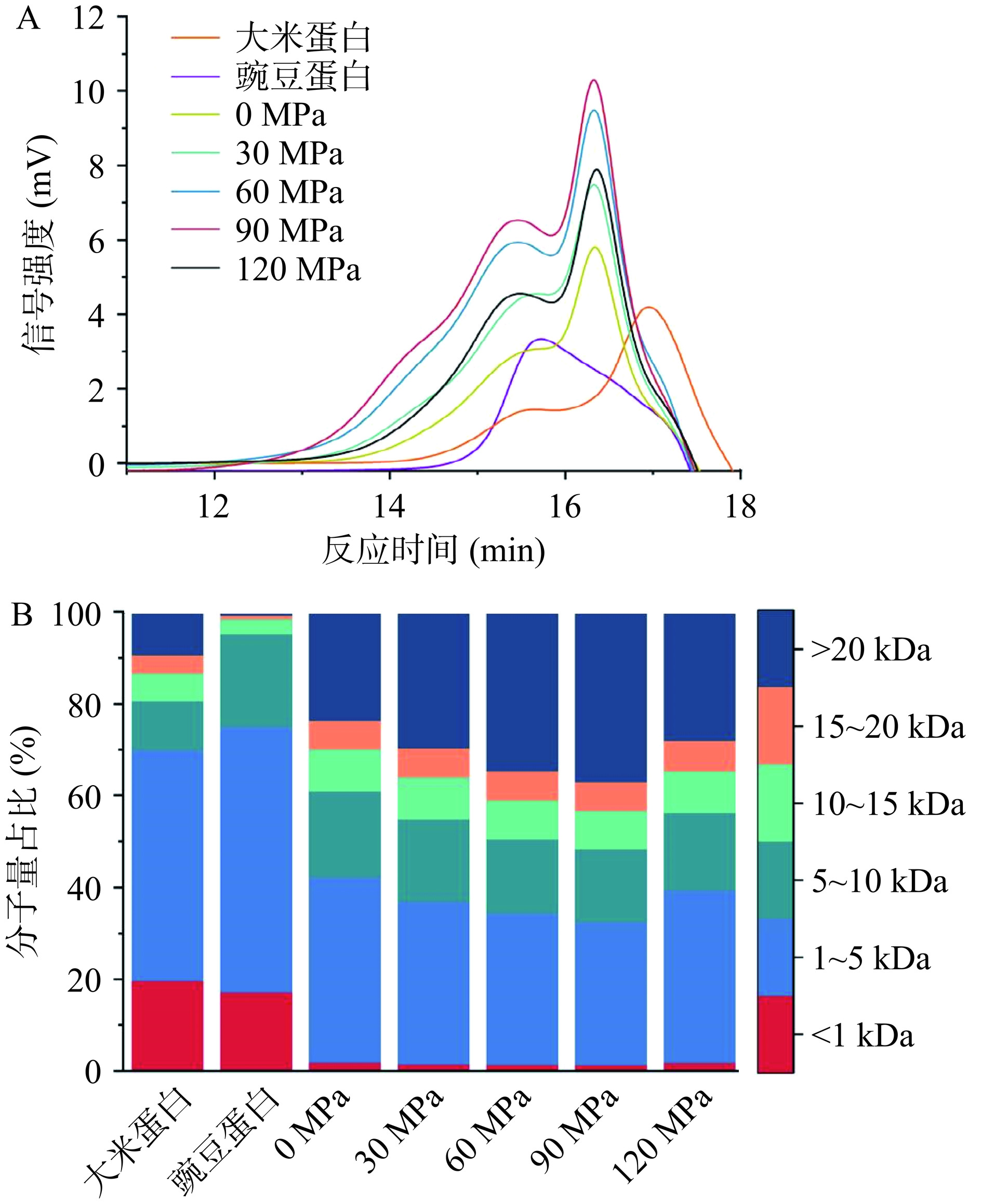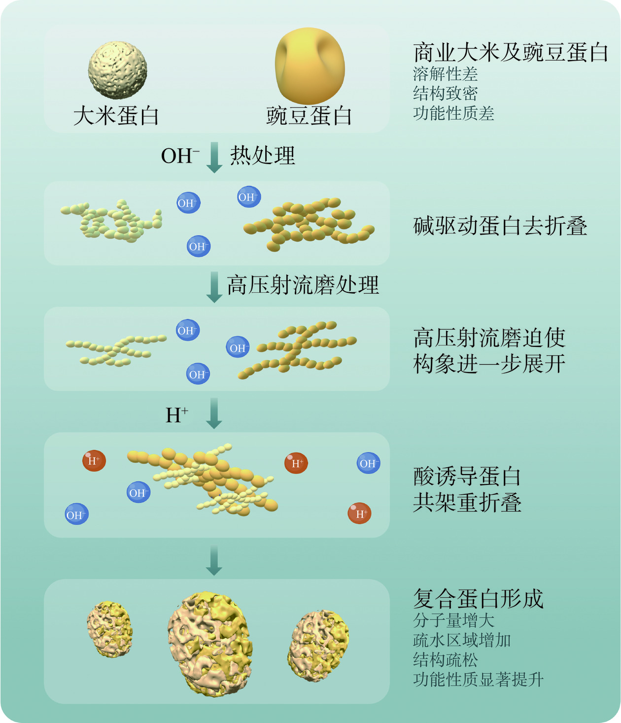 α-helix in the secondary structure as the treatment pressure increased. Furthermore, the amino acid analysis revealed that the composite protein had a balanced and complete composition of amino acids. Additionally, the emulsification and foaming properties of the treated composite proteins were superior to those of rice and pea proteins due to their high solubility. This study demonstrated that the combination of industry-scale microfluidizer and pH cycling could effectively enhance the functional properties of the composite protein. The findings provide theoretical support for solubilization and modification of plant proteins on an industrial scale.