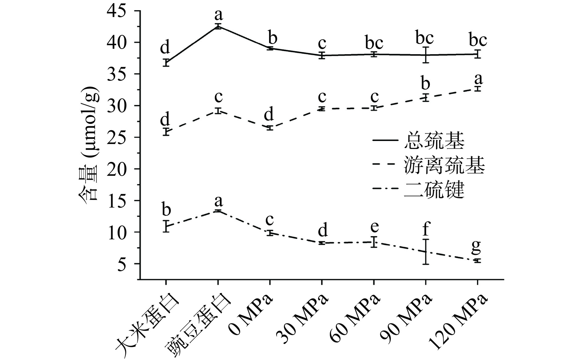 P<0.05), while disulphide bonding content decreased significantly from 9.86±0.42 μmol/g to 5.48±0.27 μmol/g (