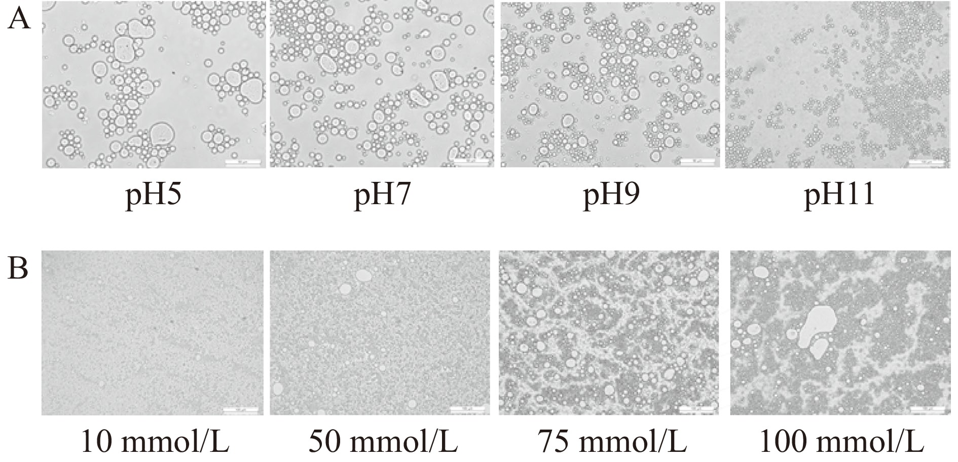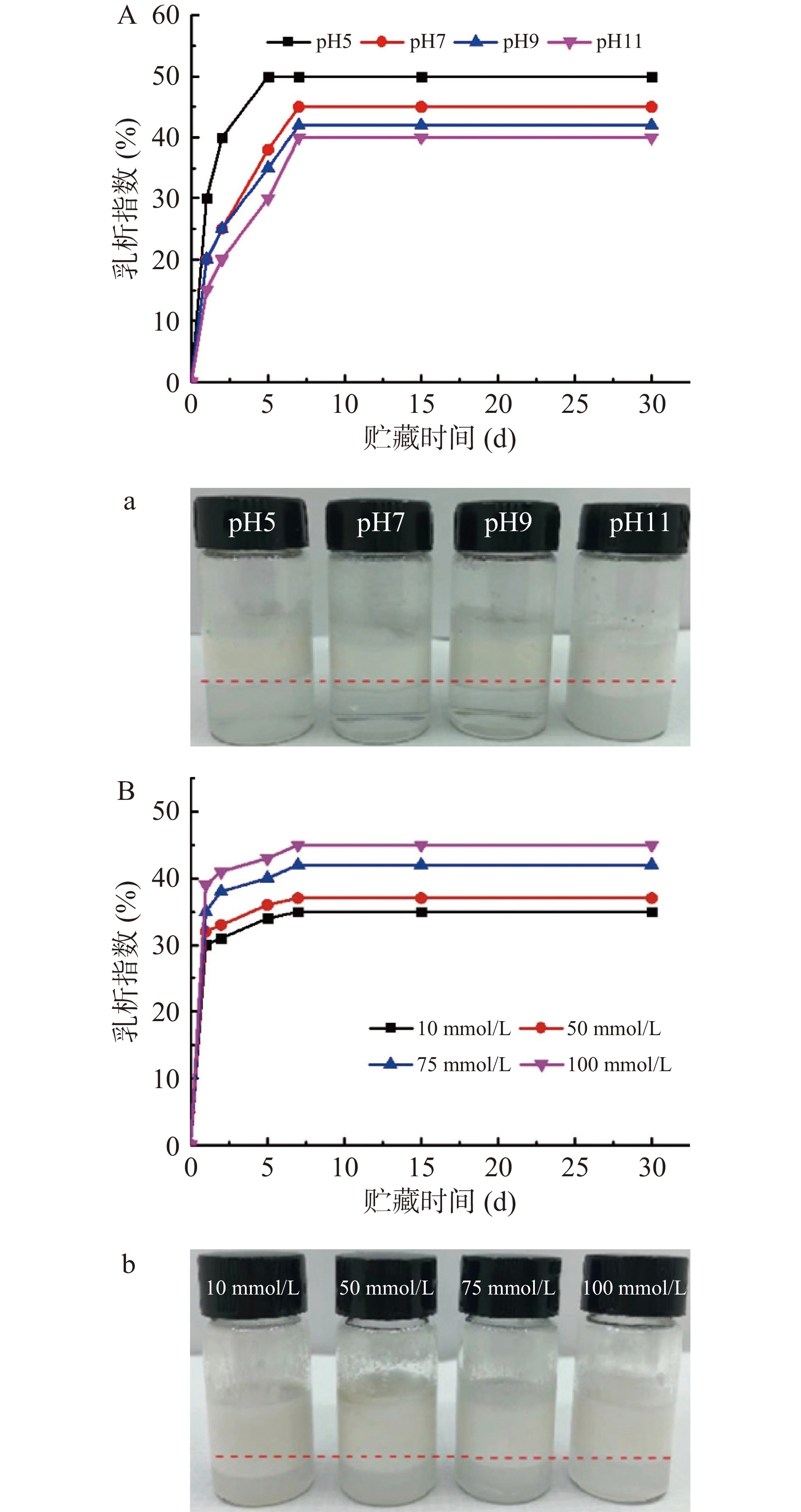 Cellulose nanocrystalline (cncs) were prepared from bagasse as raw material to stabilize the Pickering emulsion to examine the effect of pH and ionic strength on emulsion stability. The results showed that the CNCs obtained by hydrolysis had a length of about 120 nm and a crystallinity of 70%. The particle size of the Pickering emulsion stabilized by CNCs decreased with the increase of the pH value of the preparation conditions. Under the condition of pH 11, the emulsion was relatively uniform due to deprotonation. In addition, the particle size of the Pickering emulsion stabilized by CNCs increased with the concentration of salt ions. At a concentration of 100 mmol/L, the electrostatic repulsion reduced due to the electrostatic shielding effect of salt ions, the emulsion broke, and the layering became more obvious. The experimental results showed that bagasse CNCs had potential in preparing Pickering emulsion as solid particles, and would provide new ideas for the utilization of bagasse.